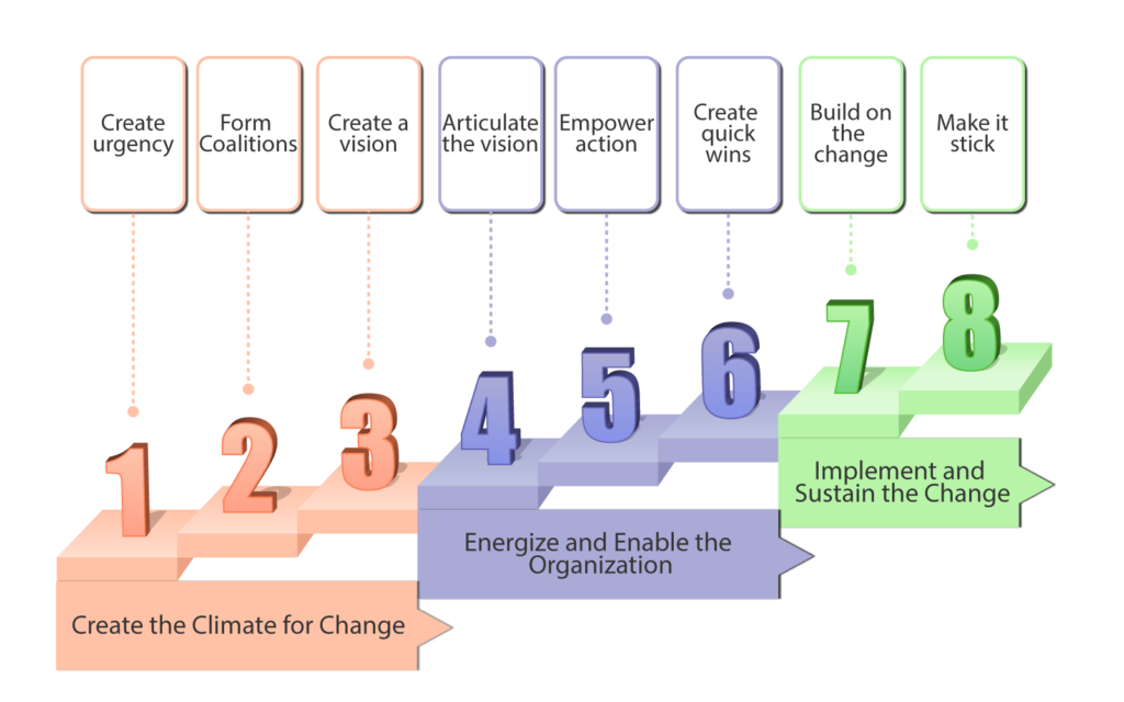 Auguste, J. 2013. Applying Kotter’s 8-step process for leading change to the digital transformation of an orthopedic surgical practice group in Toronto, Canada. J Health Med Informat, 4(3), 129.